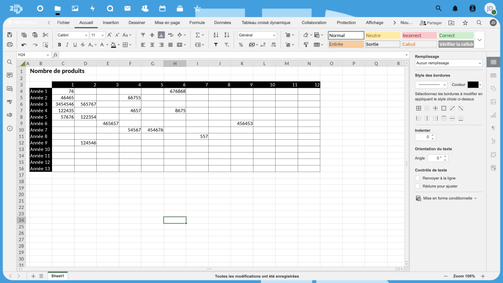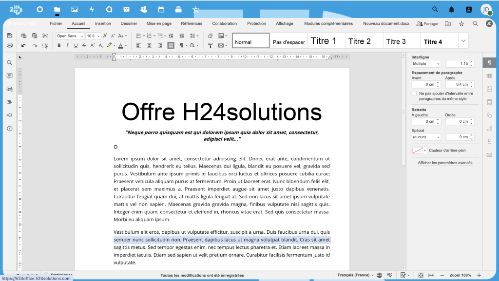 H24Office s’appuie sur ONLYOFFICE, qui utilise les formats OOXML (docx, xlsx et pptx) comme formats natifs.