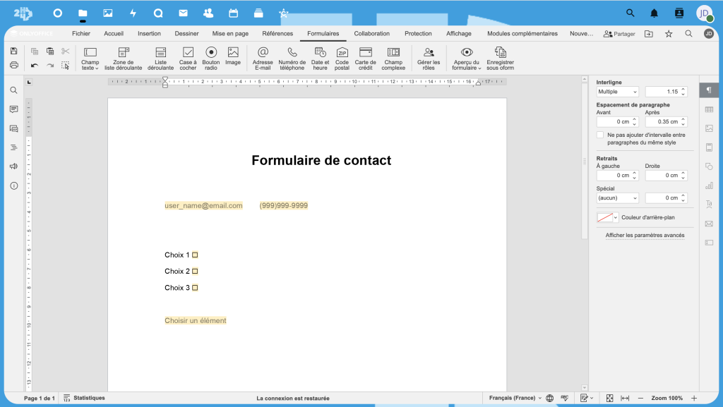 - Insertion de champs : images, listes déroulantes et cases à cocher ;